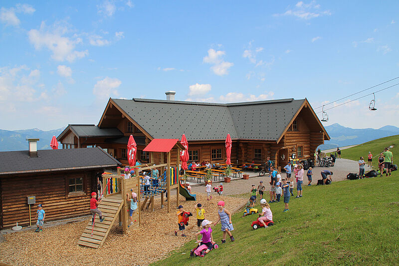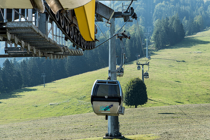 Täglich ab 9.30 Uhr pendelt die Gondelbahn Hochkössen zwischen Tal- und Bergstation hin und her. Sind Sie auf rund 1500 Metern Seehöhe angekommen, nehmen Sie sich ruhig einen Moment Zeit, um die Aussicht zu genießen. Vor Ihnen breiten sich die Gipfel des Wilden Kaisers und der Hohen Tauern aus, dazwischen erstrecken sich Seen und Wälder, sanfte Hügel und romantische Täler.