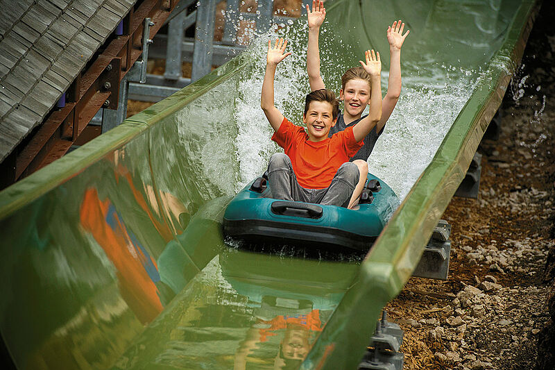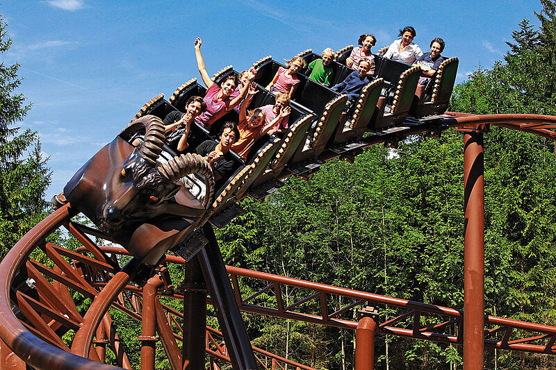 Neben den Boots-Rutschen gehört auch die Berg-Achterbahn zu den Top-Attraktionen des Parks. Mit ihr geht‘s hoch hinauf, und zwar exakt 36 Meter. Nach einer Mini-Pause, um die herrliche Aussicht von oben zu genießen, rast der „Gipfelstürmer“ mit 50 Stundenkilometern in die Tiefe. Unterwegs saust er an Baumwipfeln vorbei, legt sich gewagt in die Kurve und entlockt seinen Fahrgästen so manchen begeisterten Jauchzer. Die Mitfahrt ist ab einer Körpergröße von einem Meter möglich.